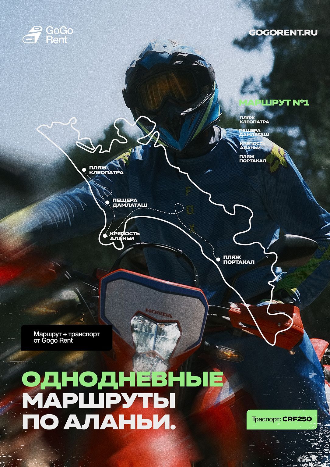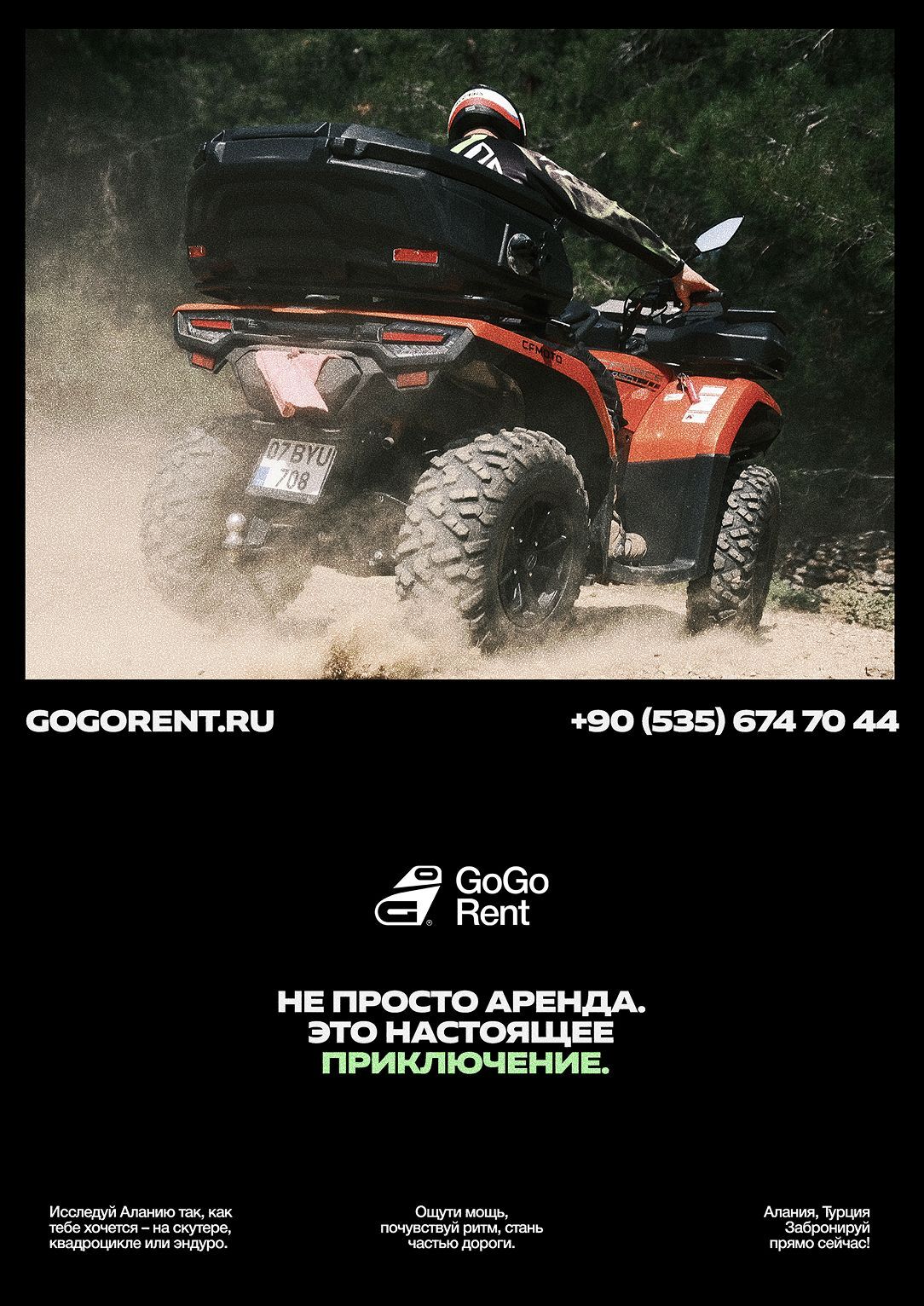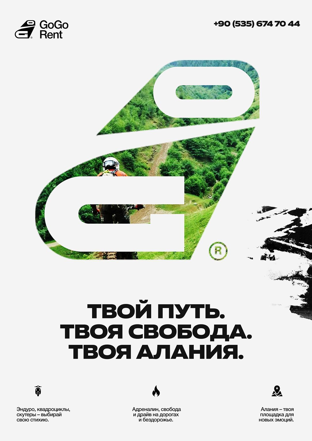 Мы сделали ставку на эмоции приключения и свободы. Дизайн строился вокруг идеи, что GoGo Rent — это не просто прокат, а способ исследовать Аланию и получить новый опыт. Визуальный стиль сочетает динамику, яркость и чистоту подачи, чтобы одинаково хорошо работать как в digital, так и в офлайн-материалах.
