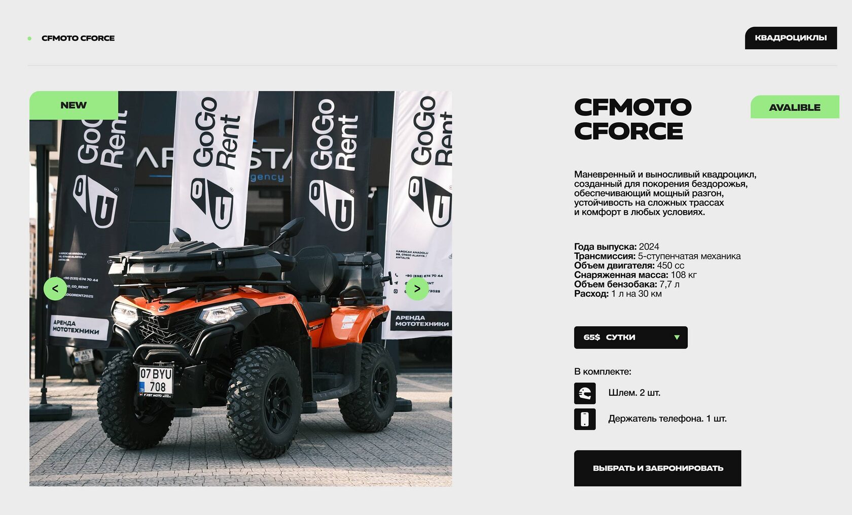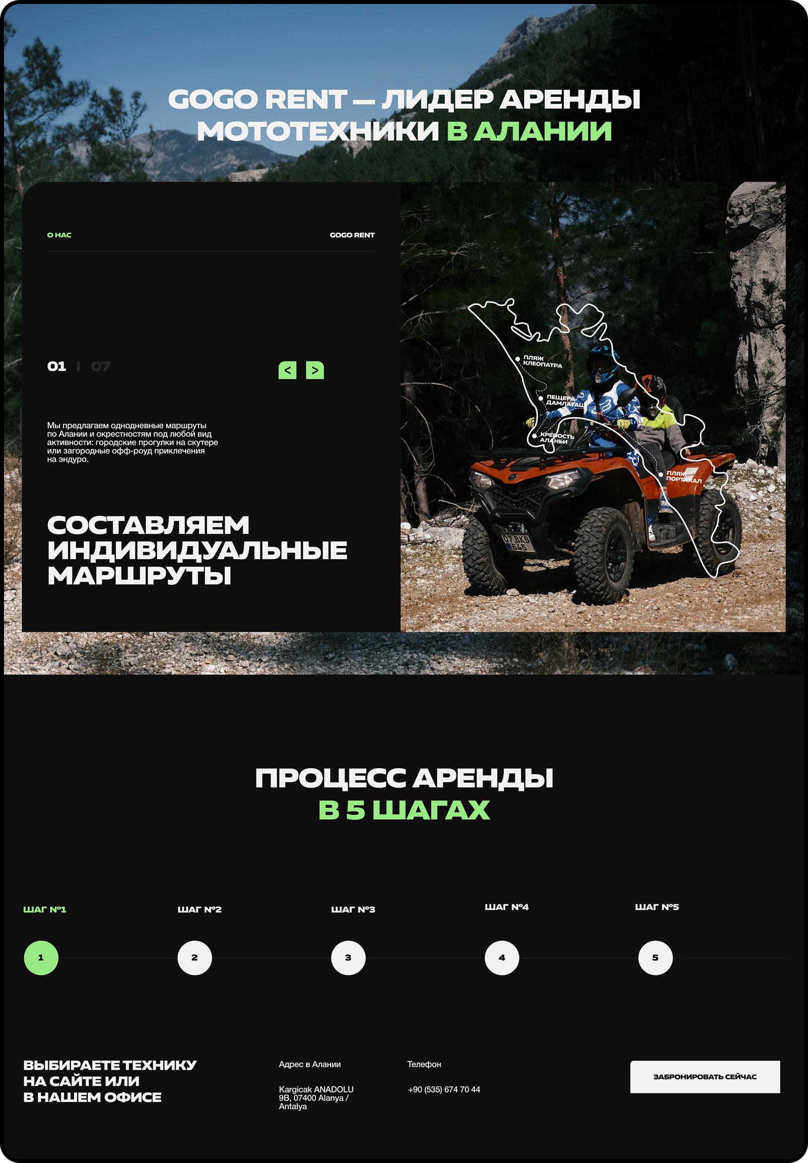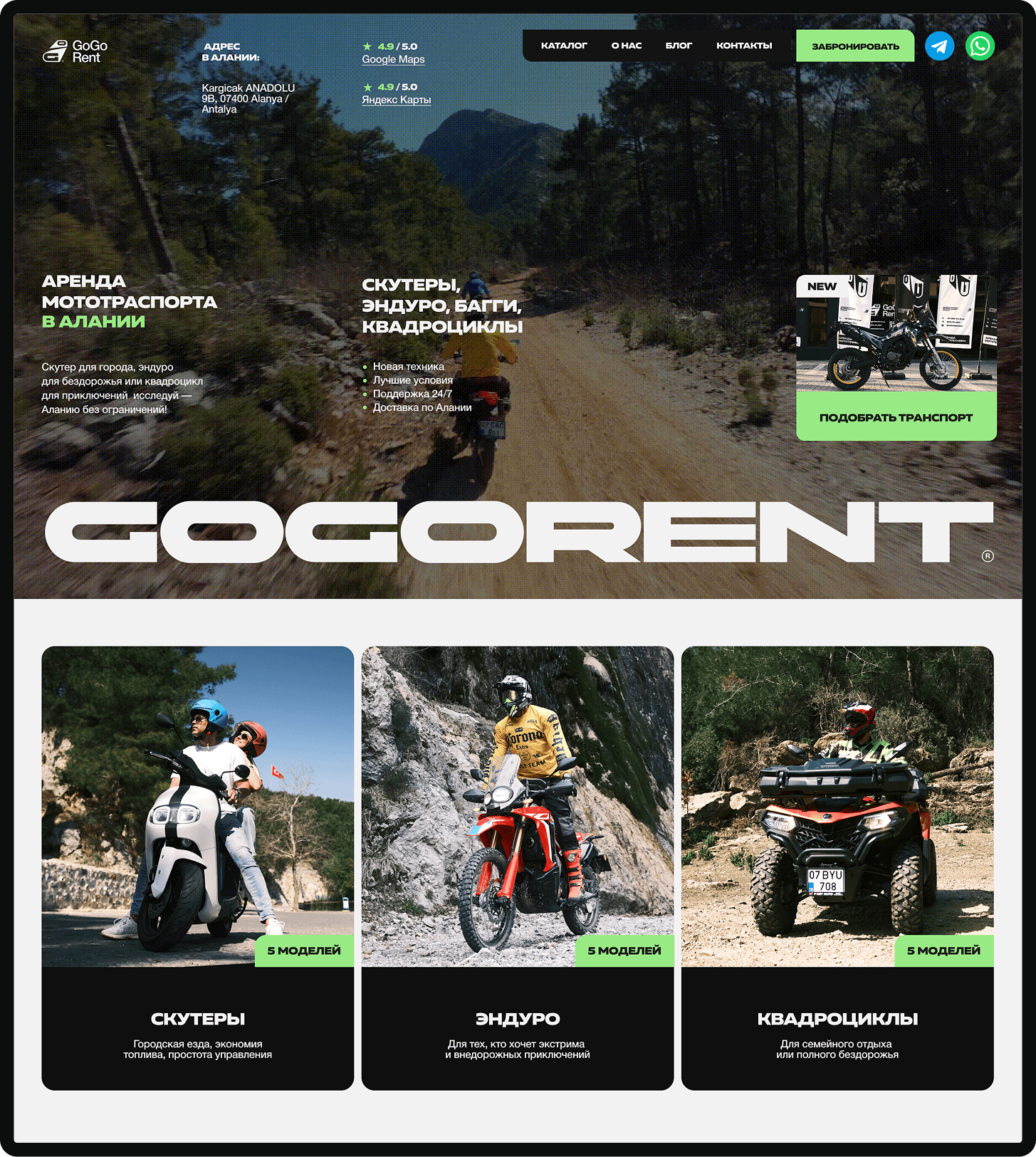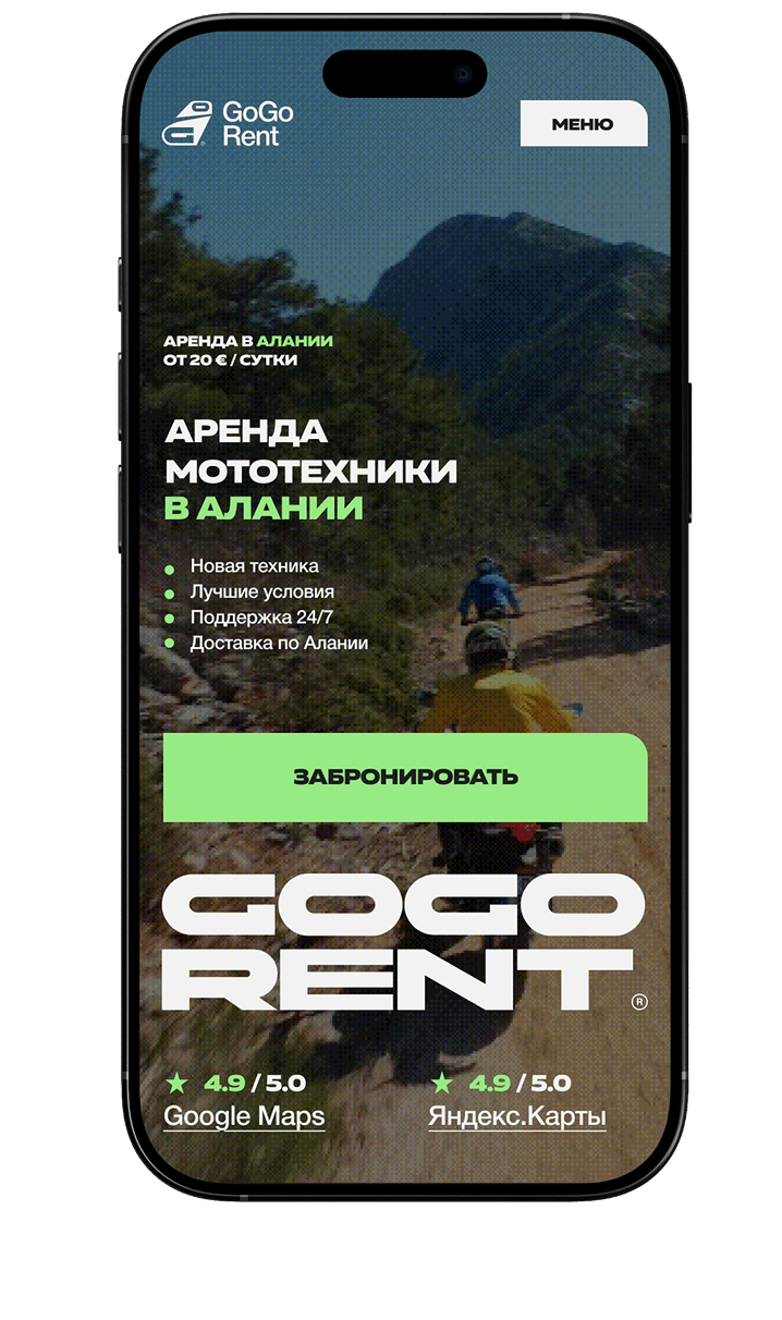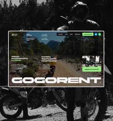 GoGo Rent — сервис аренды скутеров, эндуро и квадроциклов в Алании, которому требовалась сильная визуальная айдентика и продающий сайт для выхода на конкурентный рынок. Проект объединил стратегию, фирменный стиль и цифровой сервис.