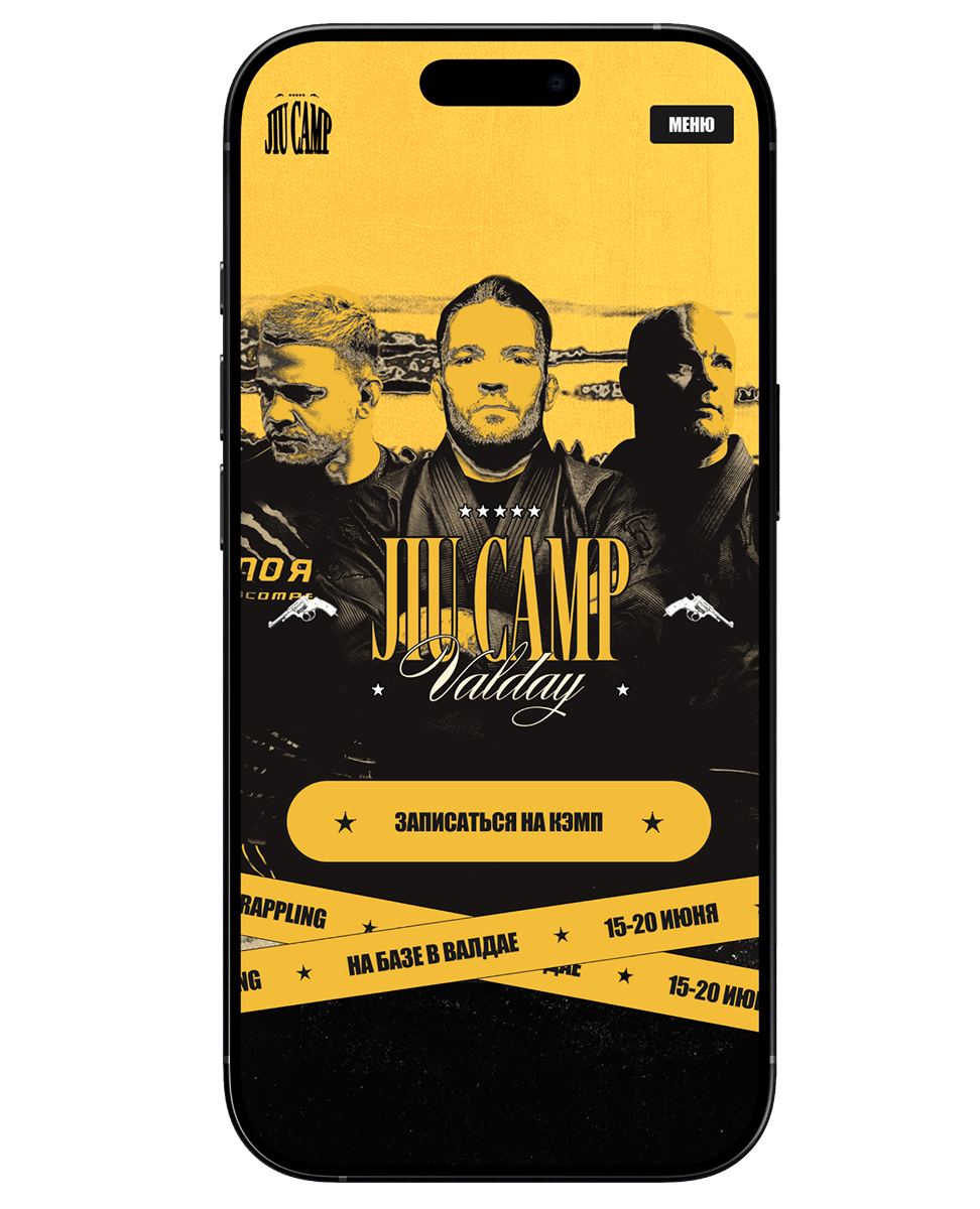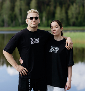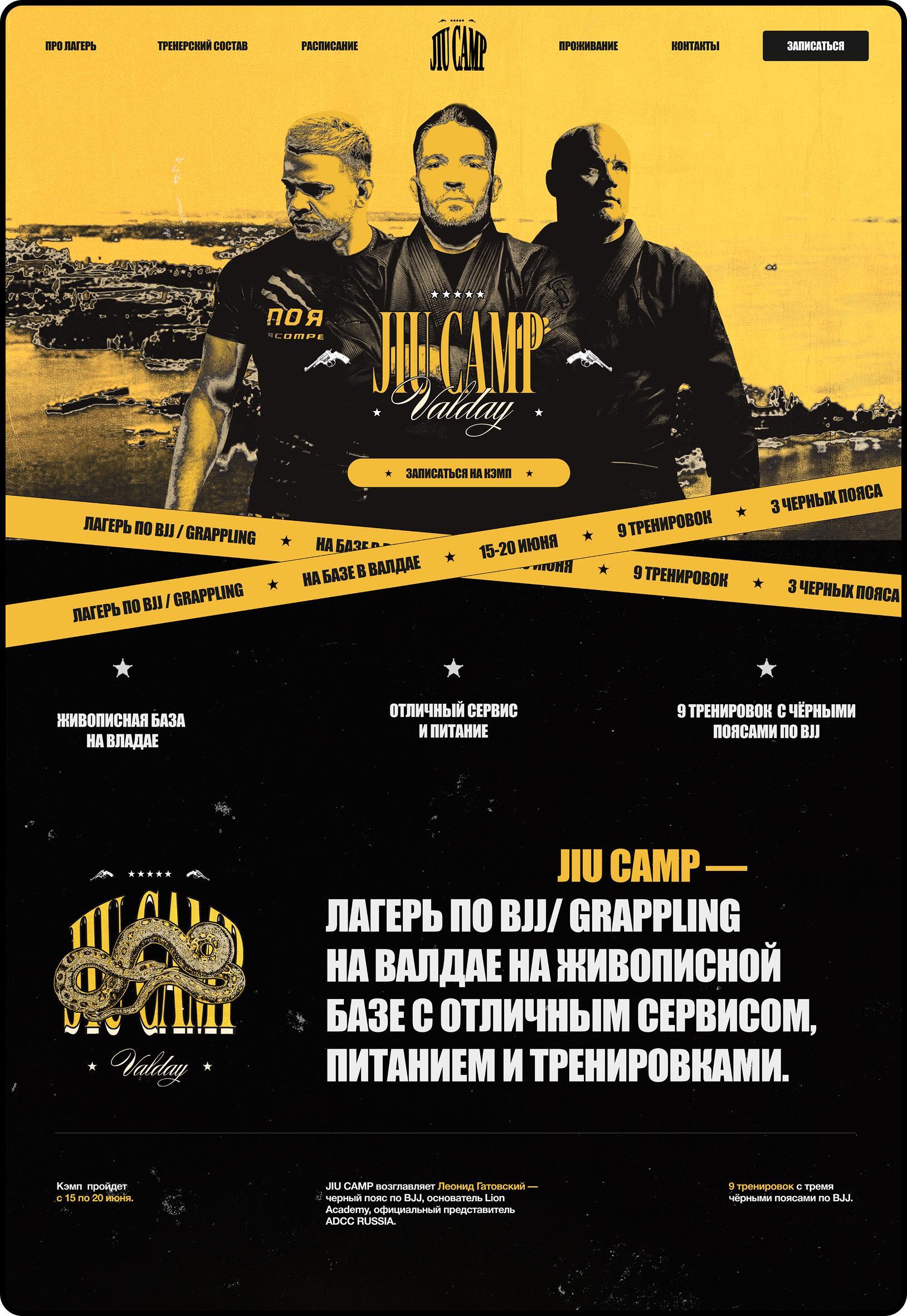 JIU Camp возглавляют три чёрных пояса по бразильскому джиу-джитсу, и их идея заключалась в том, чтобы превратить спортивный лагерь в яркое событие с собственной айдентикой и атмосферой. Передо мной стояла задача комплексной упаковки: фирменный стиль, логотип, веб-сайт, баннеры-анонсы, флаги, прессвол и мерч для участников.