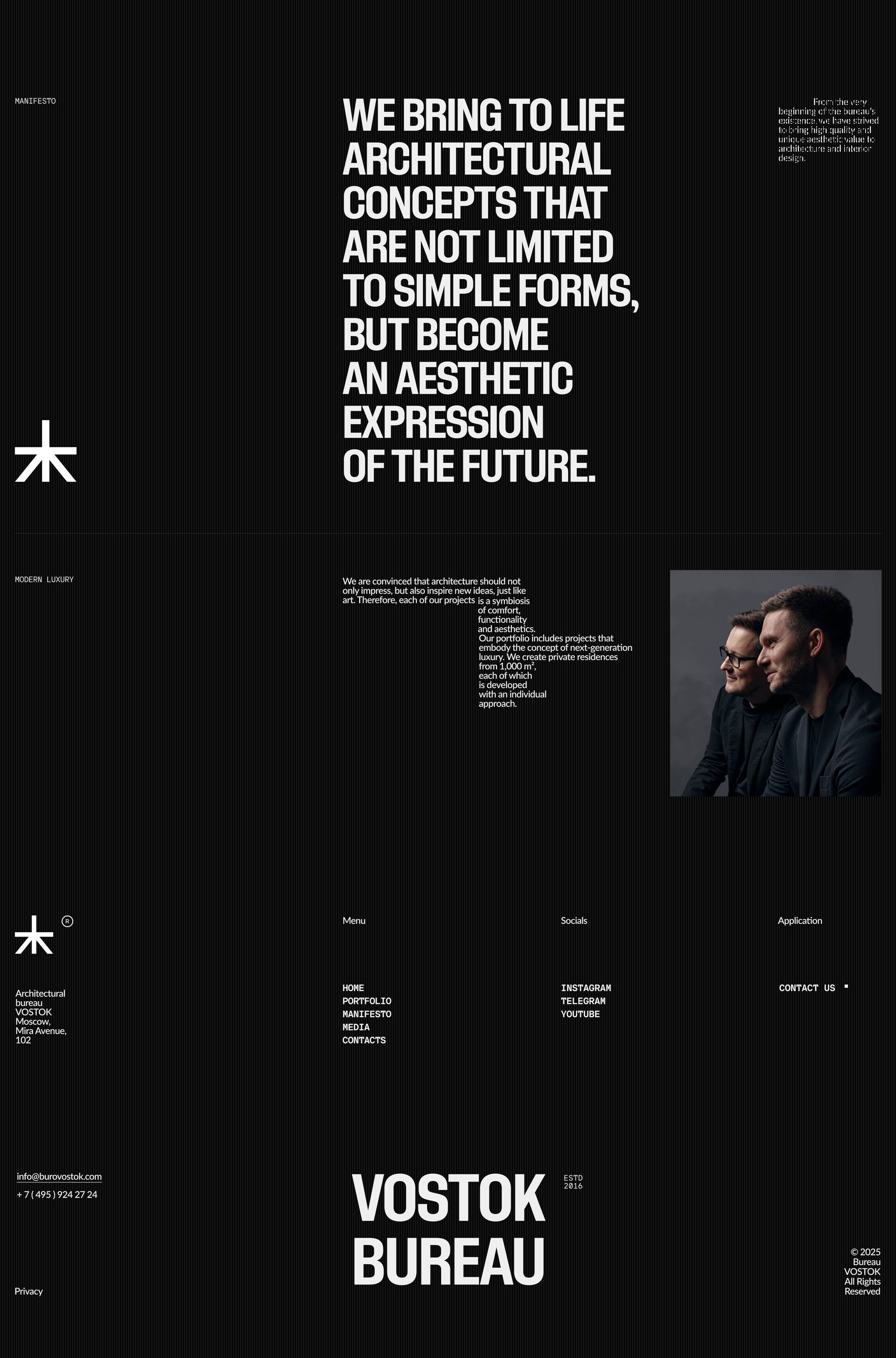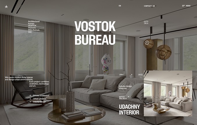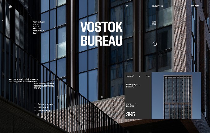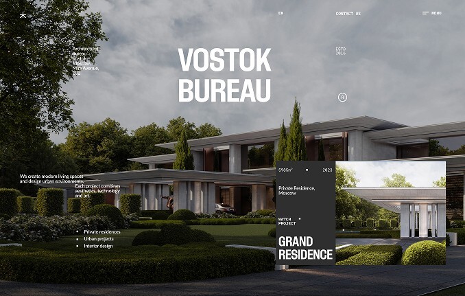 сайт для архитектурного бюро vostok, в основе которого лежит подход «projects first» — все решения в дизайне подчинены задаче ярко и чисто презентовать проекты бюро.